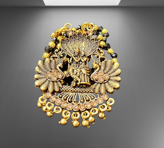 This 14.5-inch long gold-plated mangalsutra features a sacred Radha Krishna pendant, representing divine love and spiritual connection. Its timeless design blends beautifully with both traditional and modern attire, making it perfect for any occasion.